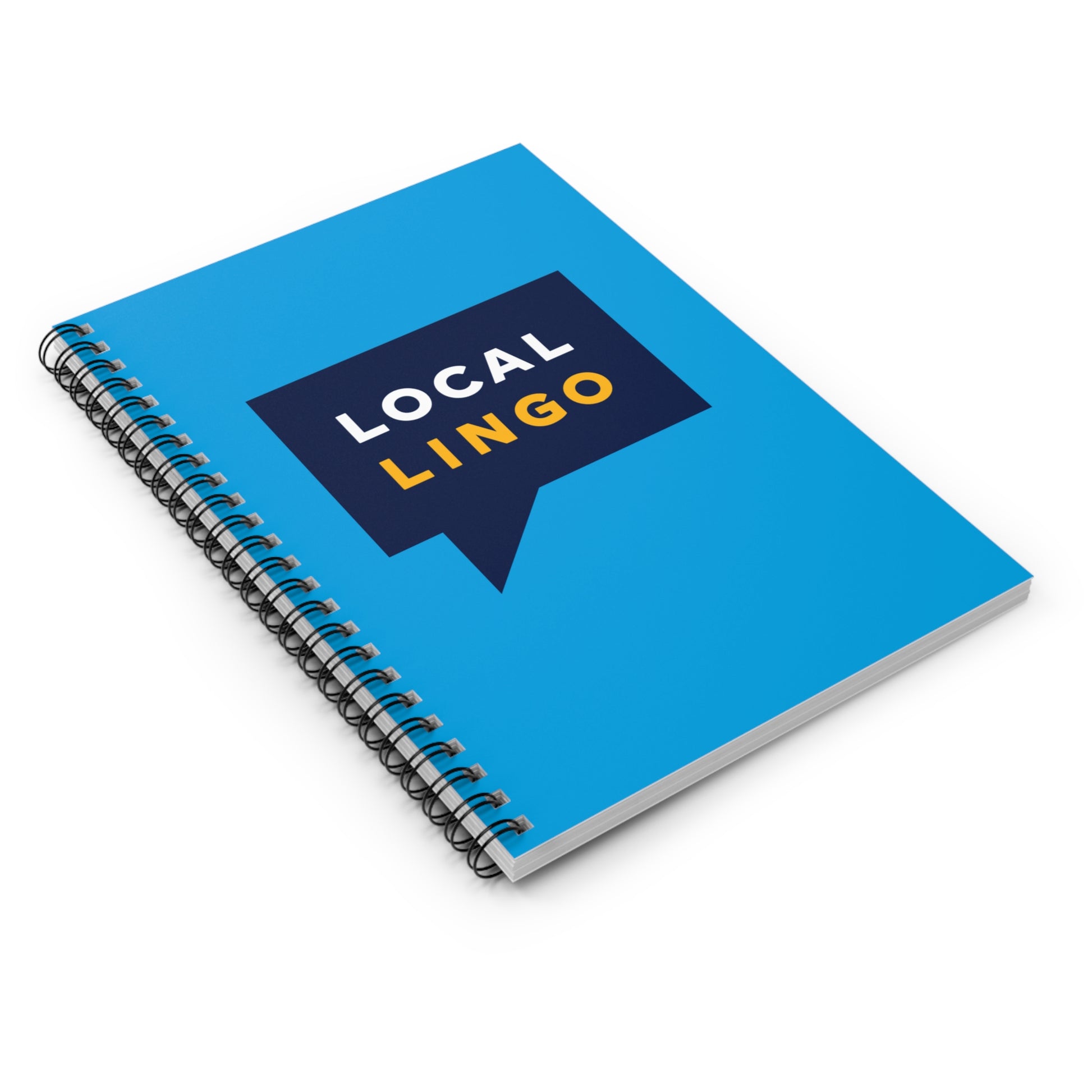 Bright, compact ruled spiral notebook designed for everyday notes, lists, and language practice. A vivid blue cover features a bold speech-bubble design labeled “LOCAL LINGO,” inviting quick ideas, vocabulary, or neighborhood observations. Inside are 118 lined pages of smooth 90gsm paper that take pen and pencil well. The sturdy 350gsm covers protect pages while a metal spiral lets the notebook lie flat or fold back for easy writing. A document pocket on the inside back cover keeps loose notes, tickets, or flashcards organized. At 6" x 8", it slips into a tote or backpack and becomes the go-to pocket-sized companion for classes, cafés, or city walks.